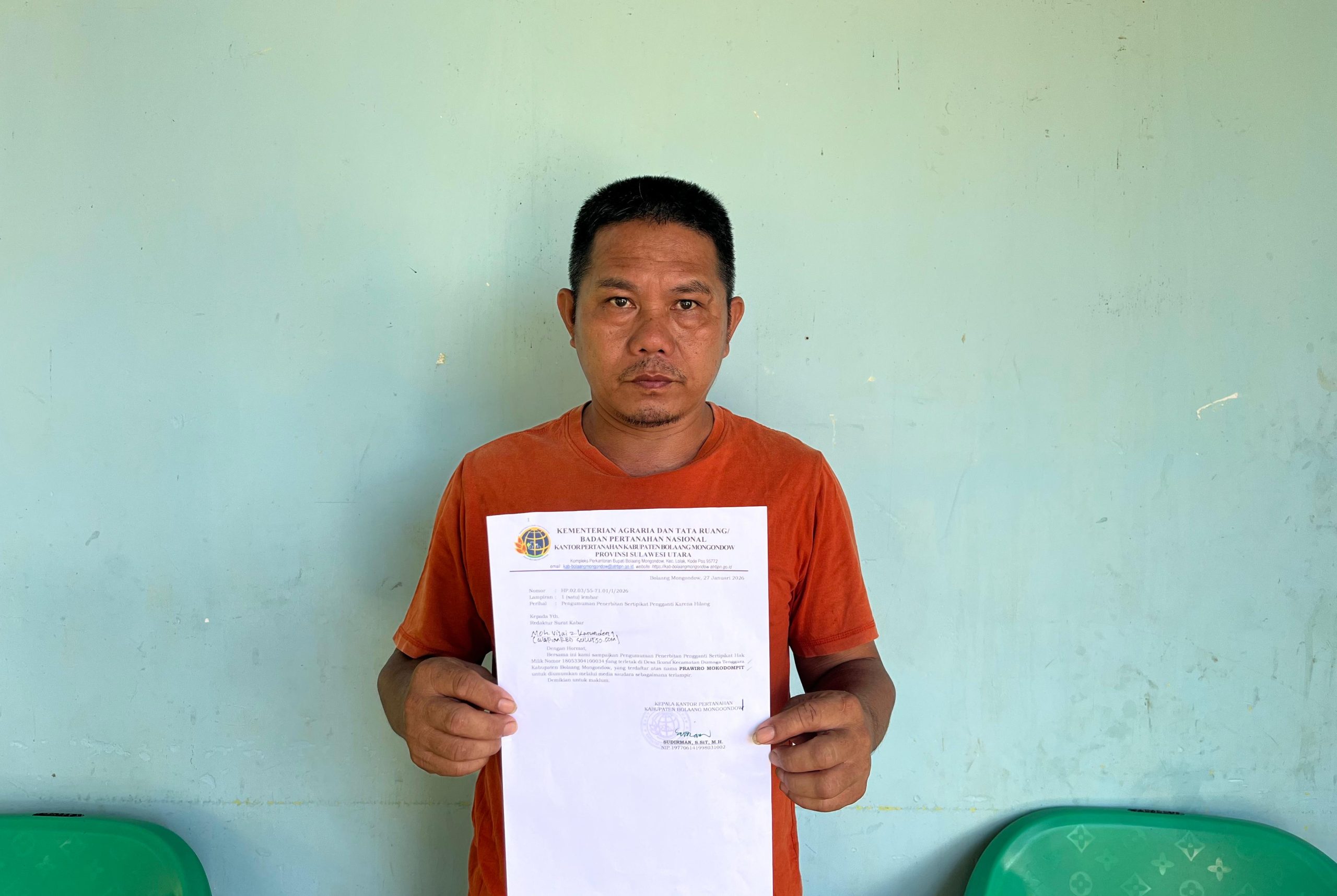 Kabar tersebut dituangkan dalam lembaran Surat Keterangan Badan Pertahanan Nasional Kabupaten Bolaang Mongondow (BPN) Nomor : 3/D1304-18.05/1/2026